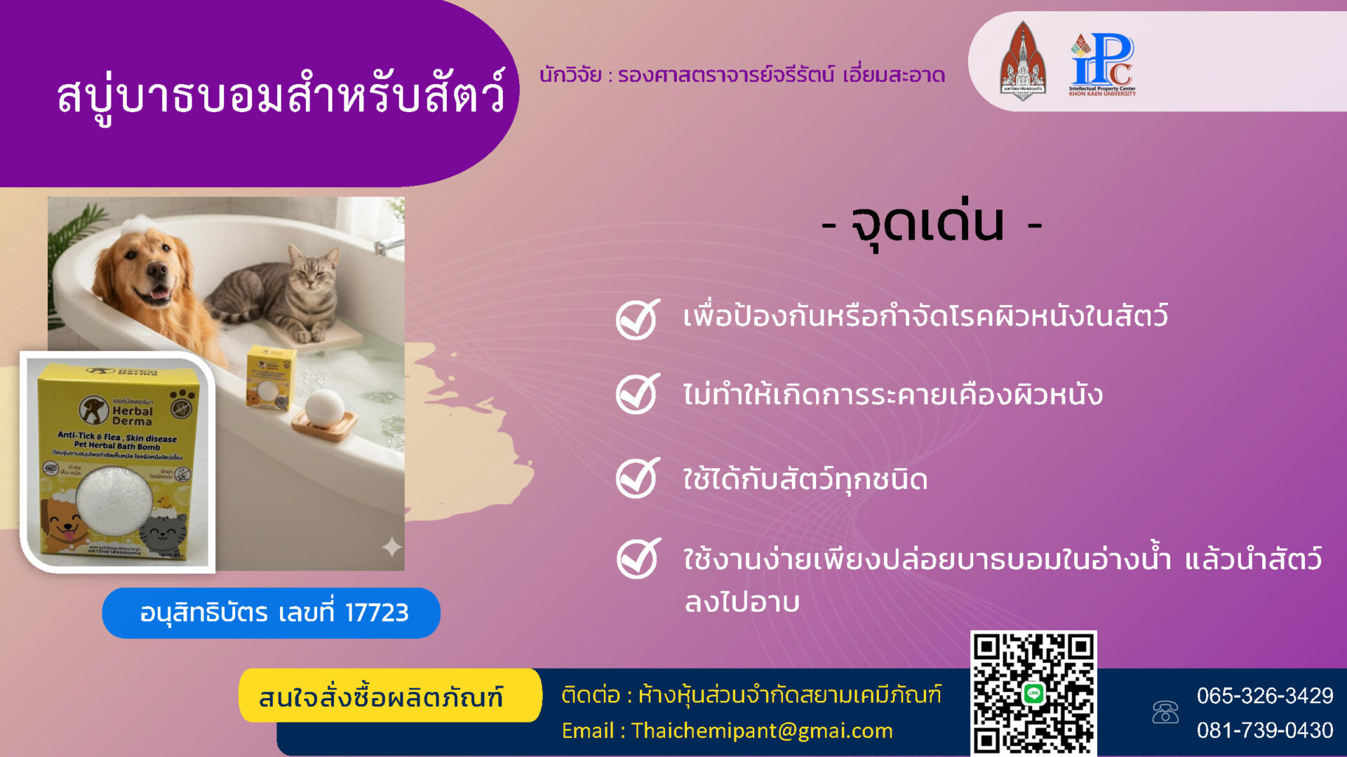 ติดต่อศูนย์ทรัพย์สินทางปัญญา: จินดาพร / พรรณรวี/ เบญจมาภรณ์ โทรศัพท์ : 086-4514455 / 043-202733